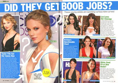 According to various news sources, Taylor Swift might of had a possible boob job. Lets face it she’s 23 and from what I’m hearing in class, most women are doneĀ developing breasts long before this age. It’s also obvious that her breastĀ cleavageĀ has went up a size.
